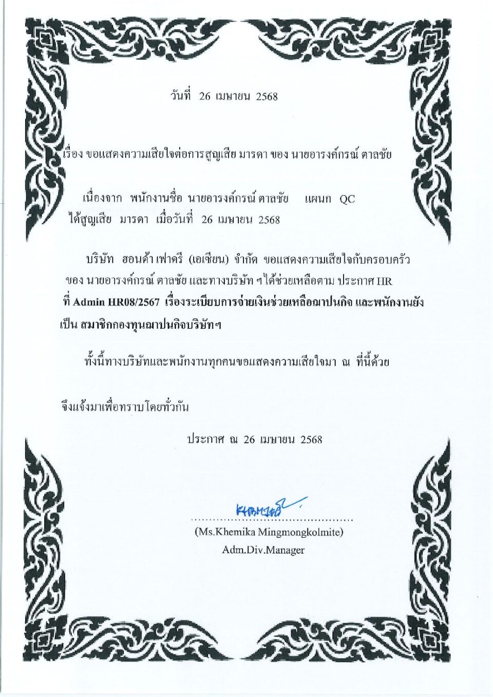 ขอแสดงความเสียใจต่อการสูญเสียมารดา นายอารงค์กรณ์ ตาลชัย HGM, ข่าวสารและกิจกรรม (News)By Phonprapa26/04/2025Leave a comment