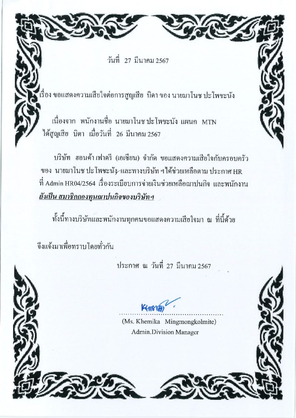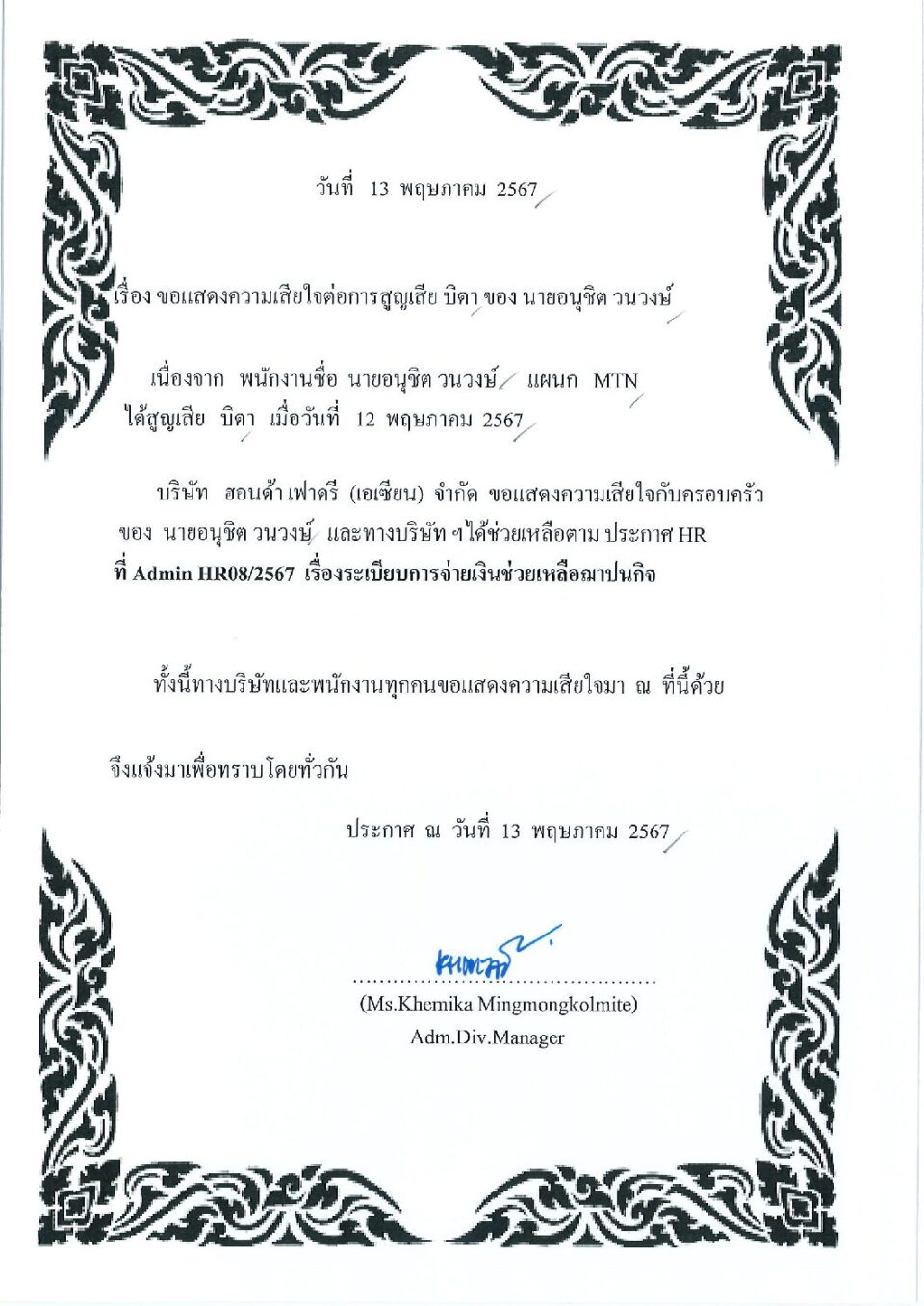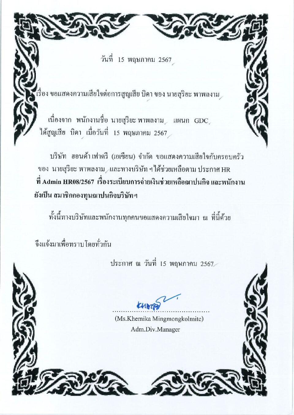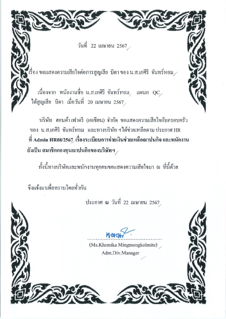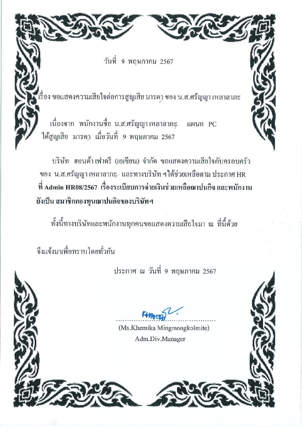ขอแสดงความเสียใจต่อการสูญเสียมารดา ของ น.ส.ศรัญญา เหลาลาภะ HGM, ข่าวสารและกิจกรรม (News)By Phonprapa09/05/2024Leave a comment
