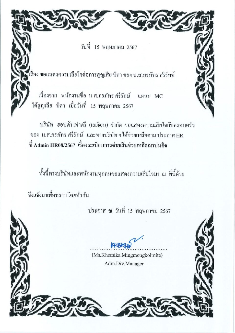 ขอแสดงความเสียใจต่อการสูญเสียบิดา ของ น.ส.ภรภัทร ศรีรักษ์ HGM, ข่าวสารและกิจกรรม (News)By Phonprapa15/05/2024Leave a comment