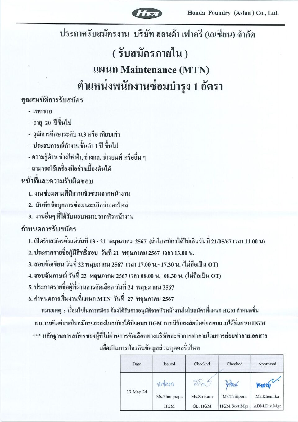 ประกาศรับสมัครพนักงานแผนกซ่อมบำรุง (ภายใน) HGM, ข่าวสารและกิจกรรม (News)By Phonprapa15/05/2024Leave a comment