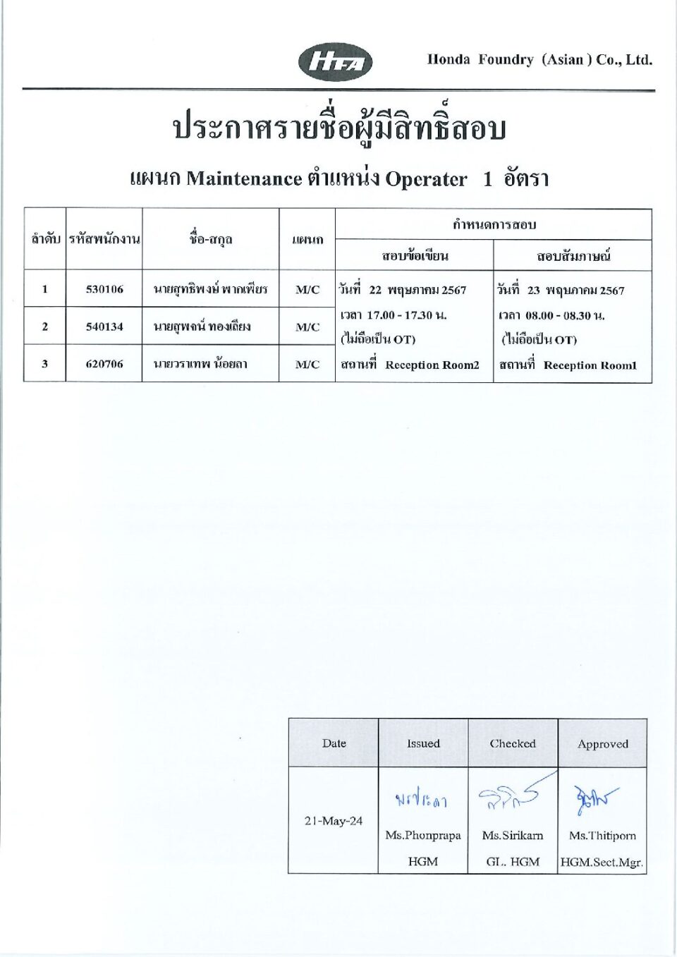 ประกาศรายชื่อผู้ผ่านการสัมภาษณ์ แผนก MTN HGM, ข่าวสารและกิจกรรม (News)By Phonprapa24/05/2024Leave a comment