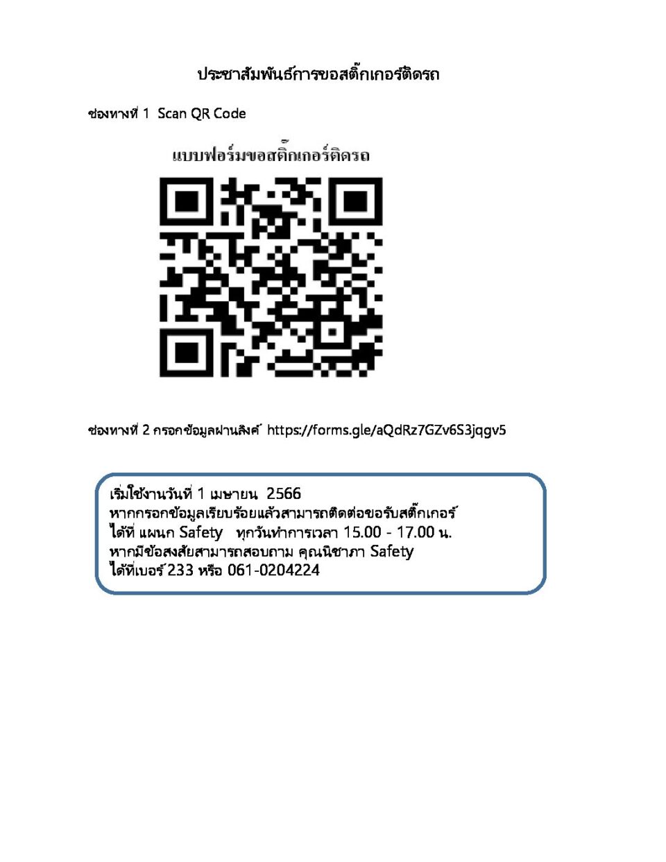 ประชาสัมพันธ์แบบฟอร์มขอสติ๊กเกอร์ติดรถ
