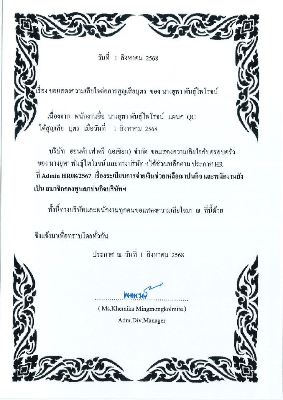 ขอแสดงความเสียใจต่อการสูญเสียบุตร นางยุพา พันธุ์ไพโรจน์ HGM, กิจกรรมเพื่อสังคม (CSR)By Phonprapa02/08/2025Leave a comment