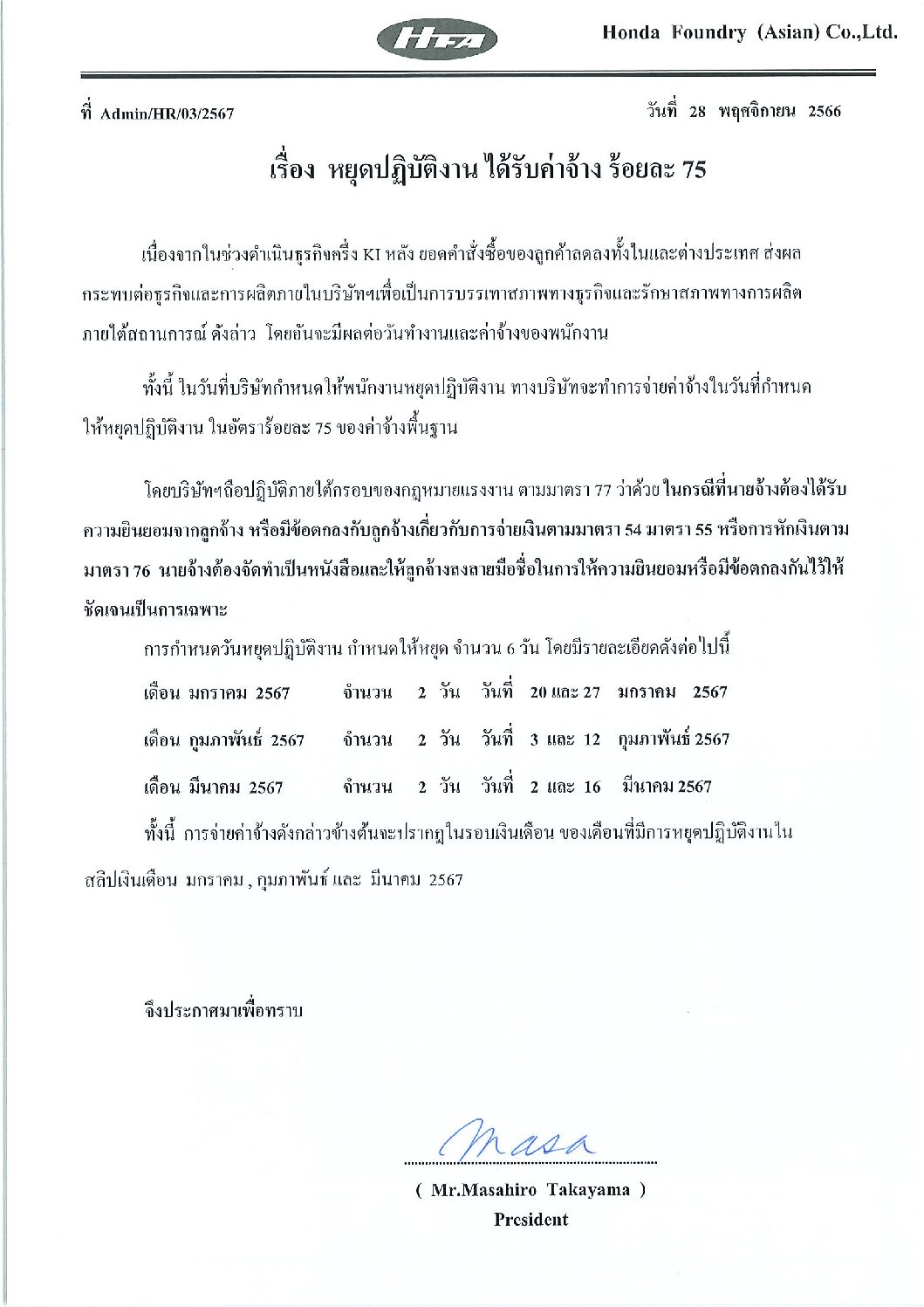 พ.ย.302023HGMข่าวสารและกิจกรรม (News) Categories: HGM, ข่าวสารและกิจกรรม (News)By Phonprapa30/11/2023 Author: Phonprapa Post navigationPreviousPrevious post:ขอแสดงความเสียใจต่อการสูญเสียมารดาของ นายปิยะพงษ์ ชาประวังNextNext post:ประกาศการจ่ายโบนัสประจำปี 2023 และปรับค่าจ้างประจำปี 2024Related posts2026.04.03 ประชาสัมพันธ์กิจกรรมรับบริจาคโลหิต14/03/2026ประชาสัมพันธ์ประชาสัมพันธ์บริการให้คำปรึกษาสุขภาพทั่วไป06/03/2026Event Safety Committee Mar’2603/03/2026แจ้งเปลี่ยนแปลงห้องเบิกจ่ายอุปกรณ์ป้องกันอันตรายส่วนบุคคล (PPE) และ วันเบิก-จ่าย03/03/2026จดหมายข่าวด้านความปลอดภัยอาชีวอนามัย และสิ่งแวดล้อม ประจำเดือนมีนาคม 256903/03/2026ประชาสัมพันธ์ การใช้เหยี่ยวไล่นกภายในโรงงาน03/03/2026ขอแสดงความเสียใจต่อการสูญเสียมารดา นายเปี่ยมศักดิ์ นาคบุญเลิศ03/03/2026Open Canteen 09.02.202608/02/2026