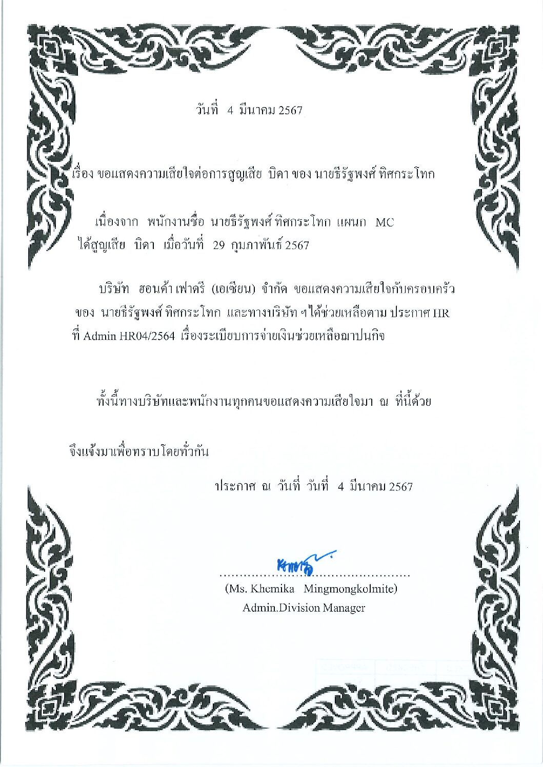 มี.ค.42024HGMข่าวสารและกิจกรรม (News) Categories: HGM, ข่าวสารและกิจกรรม (News)By Phonprapa04/03/2024 Author: Phonprapa Post navigationPreviousPrevious post:ขอแสดงความเสียใจต่อการสูญเสียบิดา ของ นางสายชล สาครรัมย์NextNext post:เรียนเชิญเข้าร่วมเปิดงานกิจกรรม Q-Event 22 Ki เข้าสู่ 23 KiRelated posts2026.04.03 ประชาสัมพันธ์กิจกรรมรับบริจาคโลหิต14/03/2026ประชาสัมพันธ์ประชาสัมพันธ์บริการให้คำปรึกษาสุขภาพทั่วไป06/03/2026Event Safety Committee Mar’2603/03/2026แจ้งเปลี่ยนแปลงห้องเบิกจ่ายอุปกรณ์ป้องกันอันตรายส่วนบุคคล (PPE) และ วันเบิก-จ่าย03/03/2026จดหมายข่าวด้านความปลอดภัยอาชีวอนามัย และสิ่งแวดล้อม ประจำเดือนมีนาคม 256903/03/2026ประชาสัมพันธ์ การใช้เหยี่ยวไล่นกภายในโรงงาน03/03/2026ขอแสดงความเสียใจต่อการสูญเสียมารดา นายเปี่ยมศักดิ์ นาคบุญเลิศ03/03/2026Open Canteen 09.02.202608/02/2026