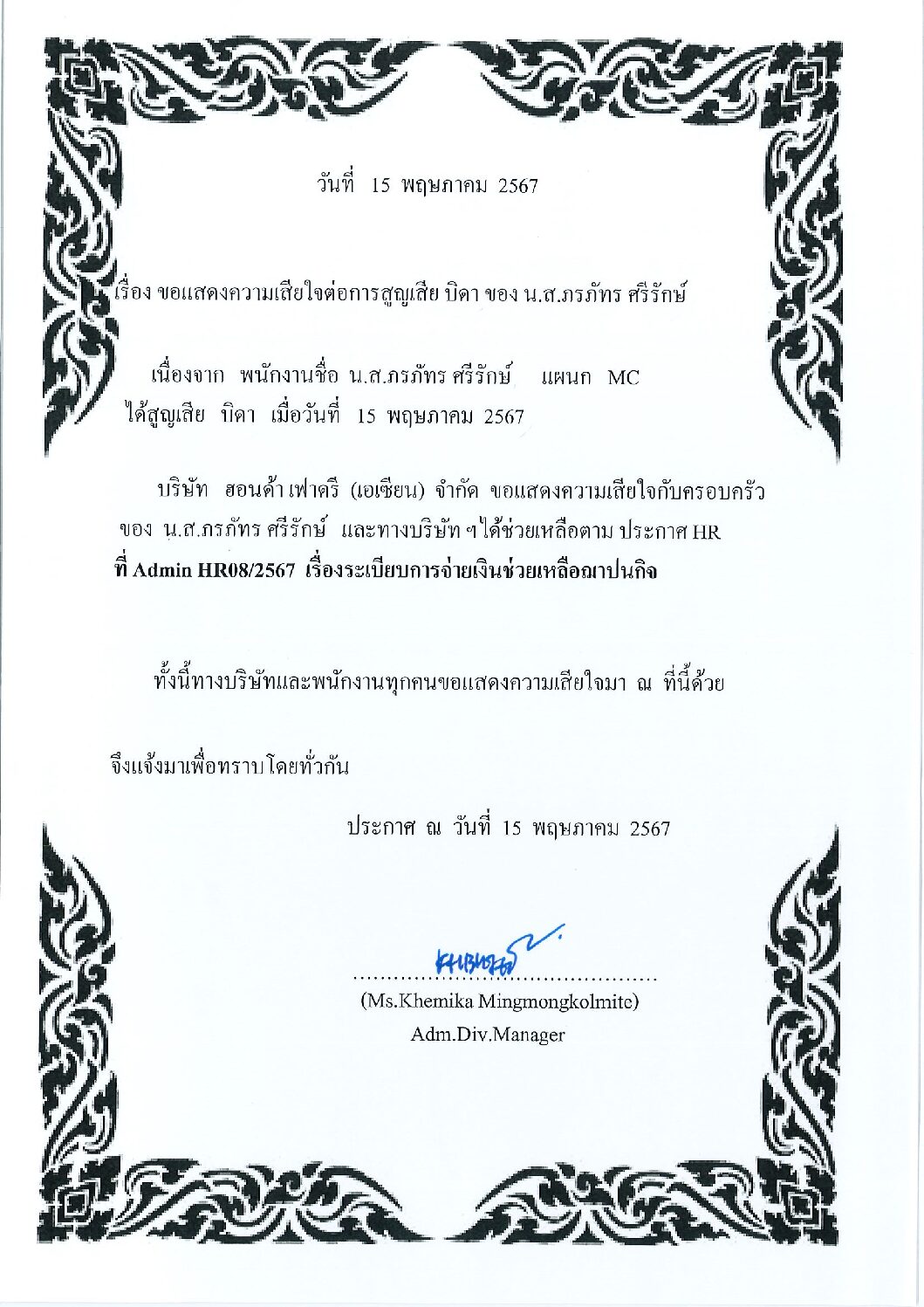 พ.ค.152024HGMข่าวสารและกิจกรรม (News) Categories: HGM, ข่าวสารและกิจกรรม (News)By Phonprapa15/05/2024 Author: Phonprapa Post navigationPreviousPrevious post:ขอแสดงความเสียใจต่อการสูญเสียบิดาของ นายสุริยะ พาพลงามNextNext post:รายชื่อผู้มีสิทธิ์สอบแผนก MTNRelated posts2026.04.03 ประชาสัมพันธ์กิจกรรมรับบริจาคโลหิต14/03/2026ประชาสัมพันธ์ประชาสัมพันธ์บริการให้คำปรึกษาสุขภาพทั่วไป06/03/2026Event Safety Committee Mar’2603/03/2026แจ้งเปลี่ยนแปลงห้องเบิกจ่ายอุปกรณ์ป้องกันอันตรายส่วนบุคคล (PPE) และ วันเบิก-จ่าย03/03/2026จดหมายข่าวด้านความปลอดภัยอาชีวอนามัย และสิ่งแวดล้อม ประจำเดือนมีนาคม 256903/03/2026ประชาสัมพันธ์ การใช้เหยี่ยวไล่นกภายในโรงงาน03/03/2026ขอแสดงความเสียใจต่อการสูญเสียมารดา นายเปี่ยมศักดิ์ นาคบุญเลิศ03/03/2026Open Canteen 09.02.202608/02/2026