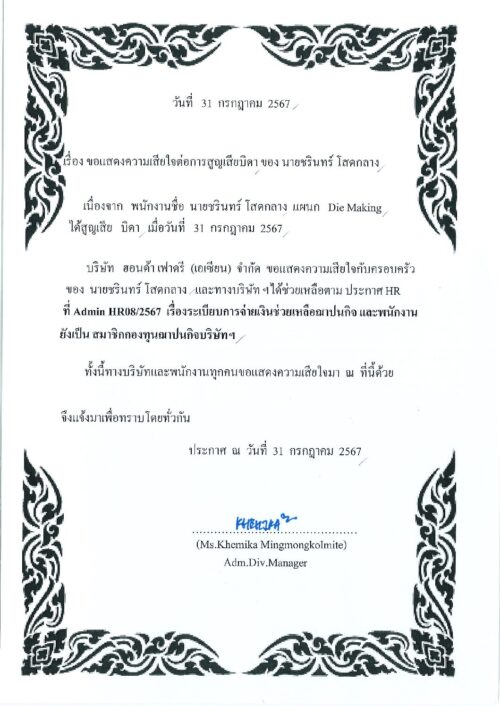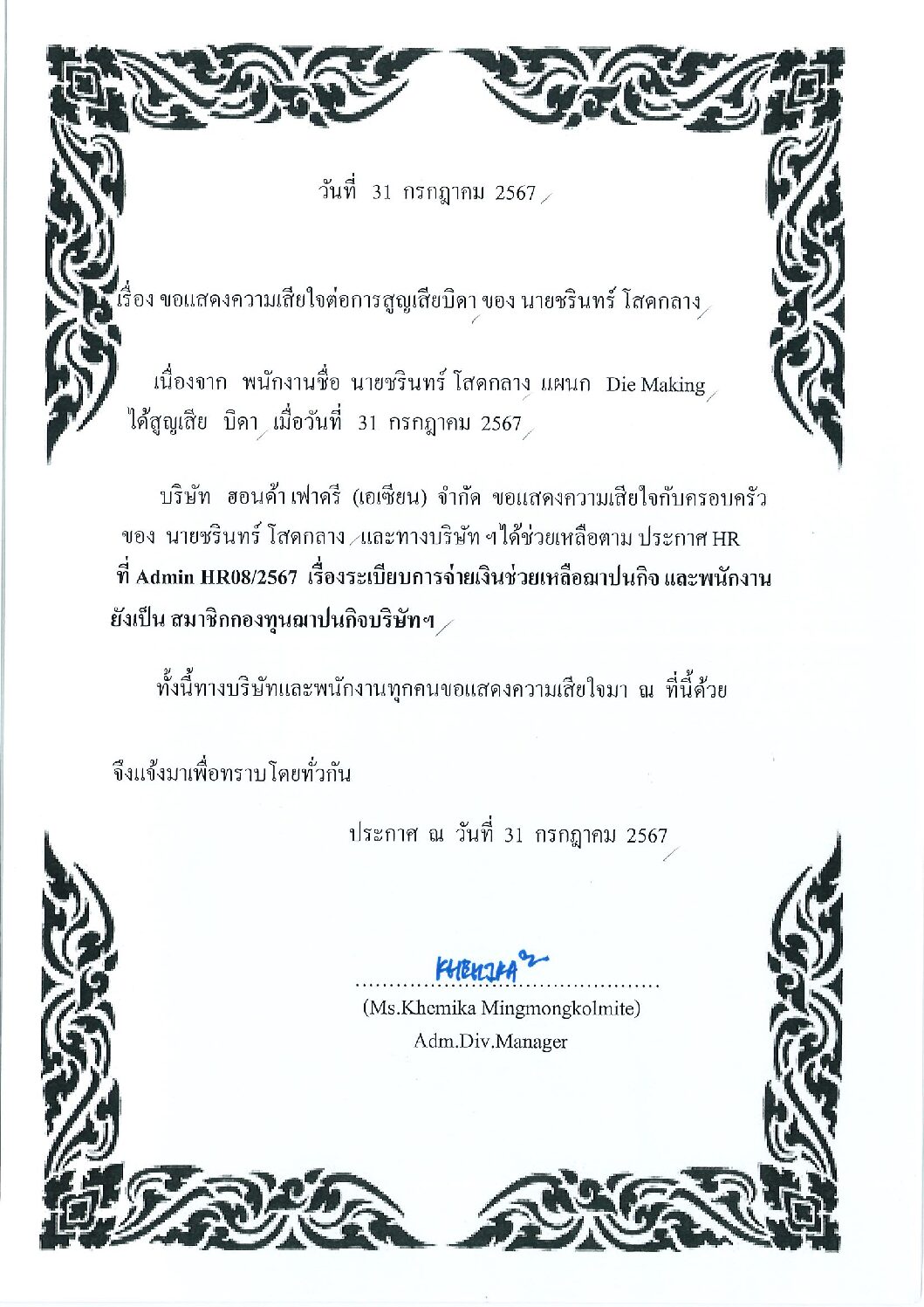 ก.ค.312024HGMข่าวสารและกิจกรรม (News) Categories: HGM, ข่าวสารและกิจกรรม (News)By Phonprapa31/07/2024 Author: Phonprapa Post navigationPreviousPrevious post:เรื่อง การดำเนินการเมื่อพนักงานไม่สามารถปฏิบัติงานได้ตามปกติอันเนื่องมาจากการเจ็บป่วยนอกเหนือจากการทำงานNextNext post:ประชาสัมพันธ์เรื่อง ความยั่งยืนด้าน ESGRelated posts2026.04.03 ประชาสัมพันธ์กิจกรรมรับบริจาคโลหิต14/03/2026ประชาสัมพันธ์ประชาสัมพันธ์บริการให้คำปรึกษาสุขภาพทั่วไป06/03/2026Event Safety Committee Mar’2603/03/2026แจ้งเปลี่ยนแปลงห้องเบิกจ่ายอุปกรณ์ป้องกันอันตรายส่วนบุคคล (PPE) และ วันเบิก-จ่าย03/03/2026จดหมายข่าวด้านความปลอดภัยอาชีวอนามัย และสิ่งแวดล้อม ประจำเดือนมีนาคม 256903/03/2026ประชาสัมพันธ์ การใช้เหยี่ยวไล่นกภายในโรงงาน03/03/2026ขอแสดงความเสียใจต่อการสูญเสียมารดา นายเปี่ยมศักดิ์ นาคบุญเลิศ03/03/2026Open Canteen 09.02.202608/02/2026