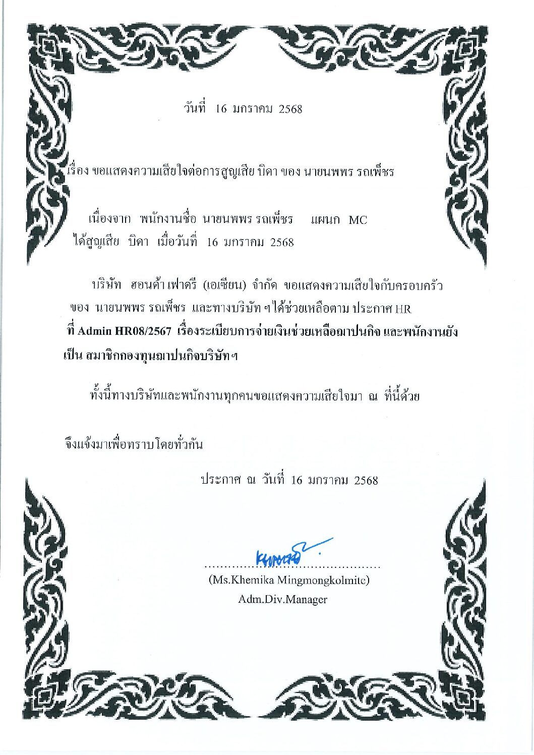 ม.ค.172025HGMข่าวสารและกิจกรรม (News) Categories: HGM, ข่าวสารและกิจกรรม (News)By Phonprapa17/01/2025 Author: Phonprapa Post navigationPreviousPrevious post:ประชาสัมพันธ์การเปลี่ยนสถานพยาบาลประกันสังคมประจำปี 2568 ( ตั้งแต่วันที่ 16 ธันวาคม 2567 – 31 มีนาคม 2568 )NextNext post:ประกาศปรับค่าแรงขั้นต่ำ 1 มกราคม 2568Related posts2026.04.03 ประชาสัมพันธ์กิจกรรมรับบริจาคโลหิต14/03/2026ประชาสัมพันธ์ประชาสัมพันธ์บริการให้คำปรึกษาสุขภาพทั่วไป06/03/2026Event Safety Committee Mar’2603/03/2026แจ้งเปลี่ยนแปลงห้องเบิกจ่ายอุปกรณ์ป้องกันอันตรายส่วนบุคคล (PPE) และ วันเบิก-จ่าย03/03/2026จดหมายข่าวด้านความปลอดภัยอาชีวอนามัย และสิ่งแวดล้อม ประจำเดือนมีนาคม 256903/03/2026ประชาสัมพันธ์ การใช้เหยี่ยวไล่นกภายในโรงงาน03/03/2026ขอแสดงความเสียใจต่อการสูญเสียมารดา นายเปี่ยมศักดิ์ นาคบุญเลิศ03/03/2026Open Canteen 09.02.202608/02/2026