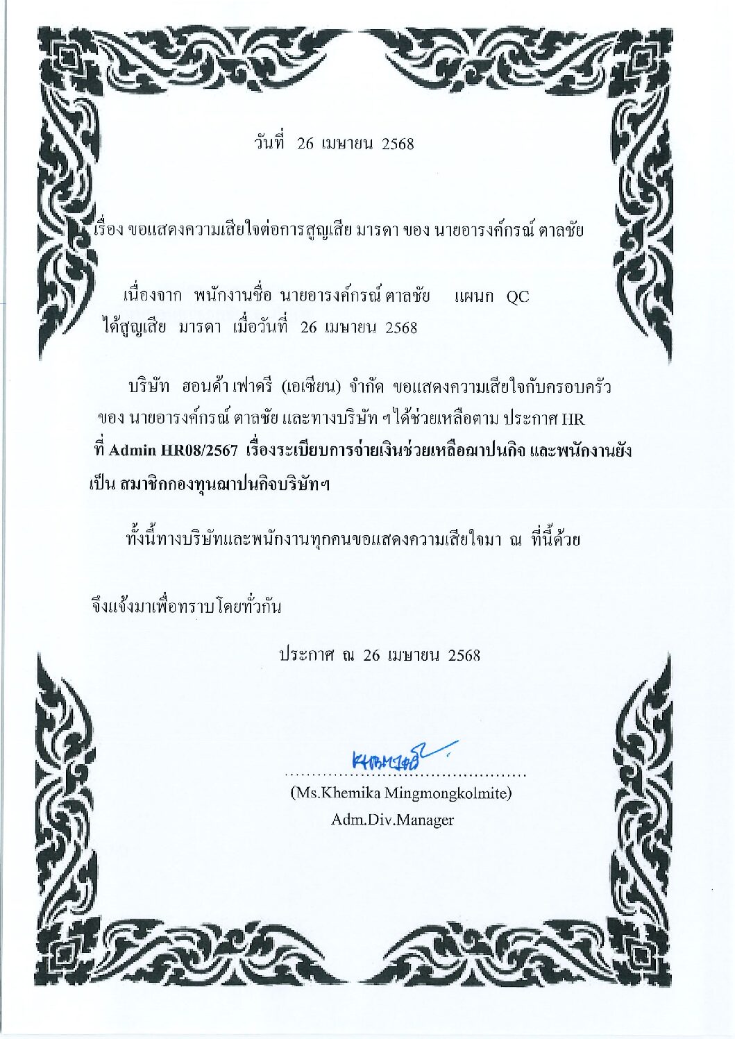 เม.ย.262025HGMข่าวสารและกิจกรรม (News) Categories: HGM, ข่าวสารและกิจกรรม (News)By Phonprapa26/04/2025 Author: Phonprapa Post navigationPreviousPrevious post:แจ้งข่าวสารที่มีการเตือนภัยพิบัติผ่าน Cell BroadcastNextNext post:กองทุนสงเคราะห์ลูกจ้างRelated posts2026.04.03 ประชาสัมพันธ์กิจกรรมรับบริจาคโลหิต14/03/2026ประชาสัมพันธ์ประชาสัมพันธ์บริการให้คำปรึกษาสุขภาพทั่วไป06/03/2026Event Safety Committee Mar’2603/03/2026แจ้งเปลี่ยนแปลงห้องเบิกจ่ายอุปกรณ์ป้องกันอันตรายส่วนบุคคล (PPE) และ วันเบิก-จ่าย03/03/2026จดหมายข่าวด้านความปลอดภัยอาชีวอนามัย และสิ่งแวดล้อม ประจำเดือนมีนาคม 256903/03/2026ประชาสัมพันธ์ การใช้เหยี่ยวไล่นกภายในโรงงาน03/03/2026ขอแสดงความเสียใจต่อการสูญเสียมารดา นายเปี่ยมศักดิ์ นาคบุญเลิศ03/03/2026Open Canteen 09.02.202608/02/2026