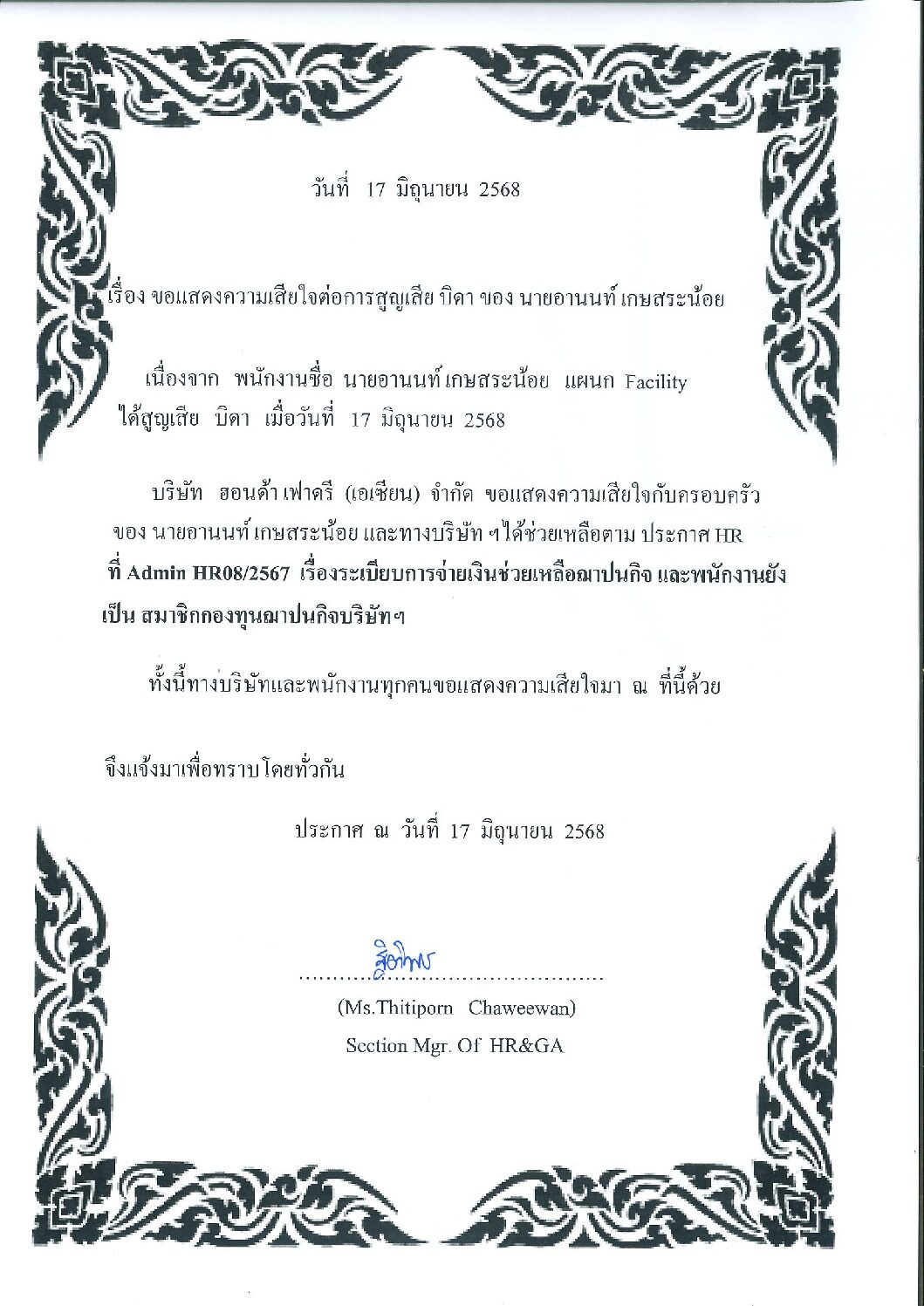 มิ.ย.182025HGMข่าวสารและกิจกรรม (News) Your list goes here! Categories: HGM, ข่าวสารและกิจกรรม (News)By Phonprapa18/06/2025 Author: Phonprapa Post navigationPreviousPrevious post:ขอแสดงความเสียใจต่อการสูญเสียบิดา นางมัทนพร โปต๊ะNextNext post:ขอแสดงความเสียใจต่อการสูญเสียมารดา นายวิวิธ ศรีโพธิ์Related posts2026.04.03 ประชาสัมพันธ์กิจกรรมรับบริจาคโลหิต14/03/2026ประชาสัมพันธ์ประชาสัมพันธ์บริการให้คำปรึกษาสุขภาพทั่วไป06/03/2026Event Safety Committee Mar’2603/03/2026แจ้งเปลี่ยนแปลงห้องเบิกจ่ายอุปกรณ์ป้องกันอันตรายส่วนบุคคล (PPE) และ วันเบิก-จ่าย03/03/2026จดหมายข่าวด้านความปลอดภัยอาชีวอนามัย และสิ่งแวดล้อม ประจำเดือนมีนาคม 256903/03/2026ประชาสัมพันธ์ การใช้เหยี่ยวไล่นกภายในโรงงาน03/03/2026ขอแสดงความเสียใจต่อการสูญเสียมารดา นายเปี่ยมศักดิ์ นาคบุญเลิศ03/03/2026Open Canteen 09.02.202608/02/2026