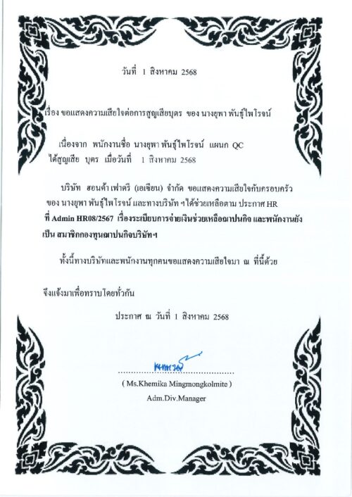 ส.ค.22025HGMกิจกรรมเพื่อสังคม (CSR) Categories: HGM, กิจกรรมเพื่อสังคม (CSR)By Phonprapa02/08/2025 Author: Phonprapa Post navigationPreviousPrevious post:ขอแสดงความเสียใจต่อการสูญเสียมารดา นายวิวิธ ศรีโพธิ์NextNext post:ประชาสัมพันธ์กำหนดกิจกรรมท่องเที่ยวประจำปี 2025Related postsประชาสัมพันธ์ การใช้เหยี่ยวไล่นกภายในโรงงาน03/03/2026ขอแสดงความเสียใจต่อการสูญเสียมารดา นายเปี่ยมศักดิ์ นาคบุญเลิศ03/03/2026Open Canteen 09.02.202608/02/2026ประชาสัมพันธ์ การ Support อาหารกลางวัน04/02/2026เรื่อง หยุดปฏิบัติงาน ได้รับค่าจ้าง ร้อยละ 7528/01/2026ประกาศเพิ่มวันหยุด ประจำปี 256906/01/2026ประชาสัมพันธ์การให้บริการ รพ.มทส.20/12/2025ประชาสัมพันธ์การเปลี่ยนสถานพยาบาลประจำปี 256920/12/2025