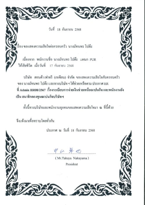ก.ย.182025AdminHGMข่าวสารและกิจกรรม (News) Categories: Admin, HGM, ข่าวสารและกิจกรรม (News)By Phonprapa18/09/2025 Author: Phonprapa Post navigationPreviousPrevious post:เชิญชวนพนักงานลงทะเบียนเข้าร่วมกิจกรรม HFA QCC 2026/24KINextNext post:ประกาศ เรื่องการปรับโครงสร้างบุคลากร ประจำปี 2568Related posts2026.04.03 ประชาสัมพันธ์กิจกรรมรับบริจาคโลหิต14/03/2026ประชาสัมพันธ์ประชาสัมพันธ์บริการให้คำปรึกษาสุขภาพทั่วไป06/03/2026Event Safety Committee Mar’2603/03/2026แจ้งเปลี่ยนแปลงห้องเบิกจ่ายอุปกรณ์ป้องกันอันตรายส่วนบุคคล (PPE) และ วันเบิก-จ่าย03/03/2026จดหมายข่าวด้านความปลอดภัยอาชีวอนามัย และสิ่งแวดล้อม ประจำเดือนมีนาคม 256903/03/2026ประชาสัมพันธ์ การใช้เหยี่ยวไล่นกภายในโรงงาน03/03/2026ขอแสดงความเสียใจต่อการสูญเสียมารดา นายเปี่ยมศักดิ์ นาคบุญเลิศ03/03/2026Open Canteen 09.02.202608/02/2026