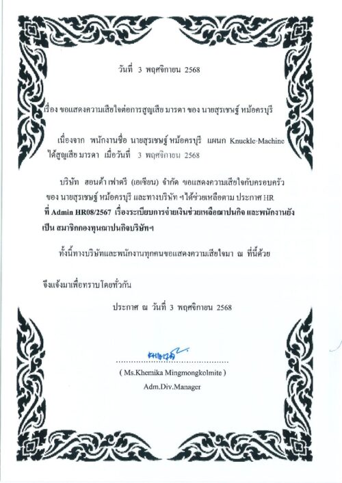 พ.ย.32025HGMข่าวสารและกิจกรรม (News) Categories: HGM, ข่าวสารและกิจกรรม (News)By Phonprapa03/11/2025 Author: Phonprapa Post navigationPreviousPrevious post:ประกาศค่าพนักงานดีเด่นประจำปี 2568NextNext post:รายงานอุบัติเหตุจากการทำงานRelated posts2026.04.03 ประชาสัมพันธ์กิจกรรมรับบริจาคโลหิต14/03/2026ประชาสัมพันธ์ประชาสัมพันธ์บริการให้คำปรึกษาสุขภาพทั่วไป06/03/2026Event Safety Committee Mar’2603/03/2026แจ้งเปลี่ยนแปลงห้องเบิกจ่ายอุปกรณ์ป้องกันอันตรายส่วนบุคคล (PPE) และ วันเบิก-จ่าย03/03/2026จดหมายข่าวด้านความปลอดภัยอาชีวอนามัย และสิ่งแวดล้อม ประจำเดือนมีนาคม 256903/03/2026ประชาสัมพันธ์ การใช้เหยี่ยวไล่นกภายในโรงงาน03/03/2026ขอแสดงความเสียใจต่อการสูญเสียมารดา นายเปี่ยมศักดิ์ นาคบุญเลิศ03/03/2026Open Canteen 09.02.202608/02/2026