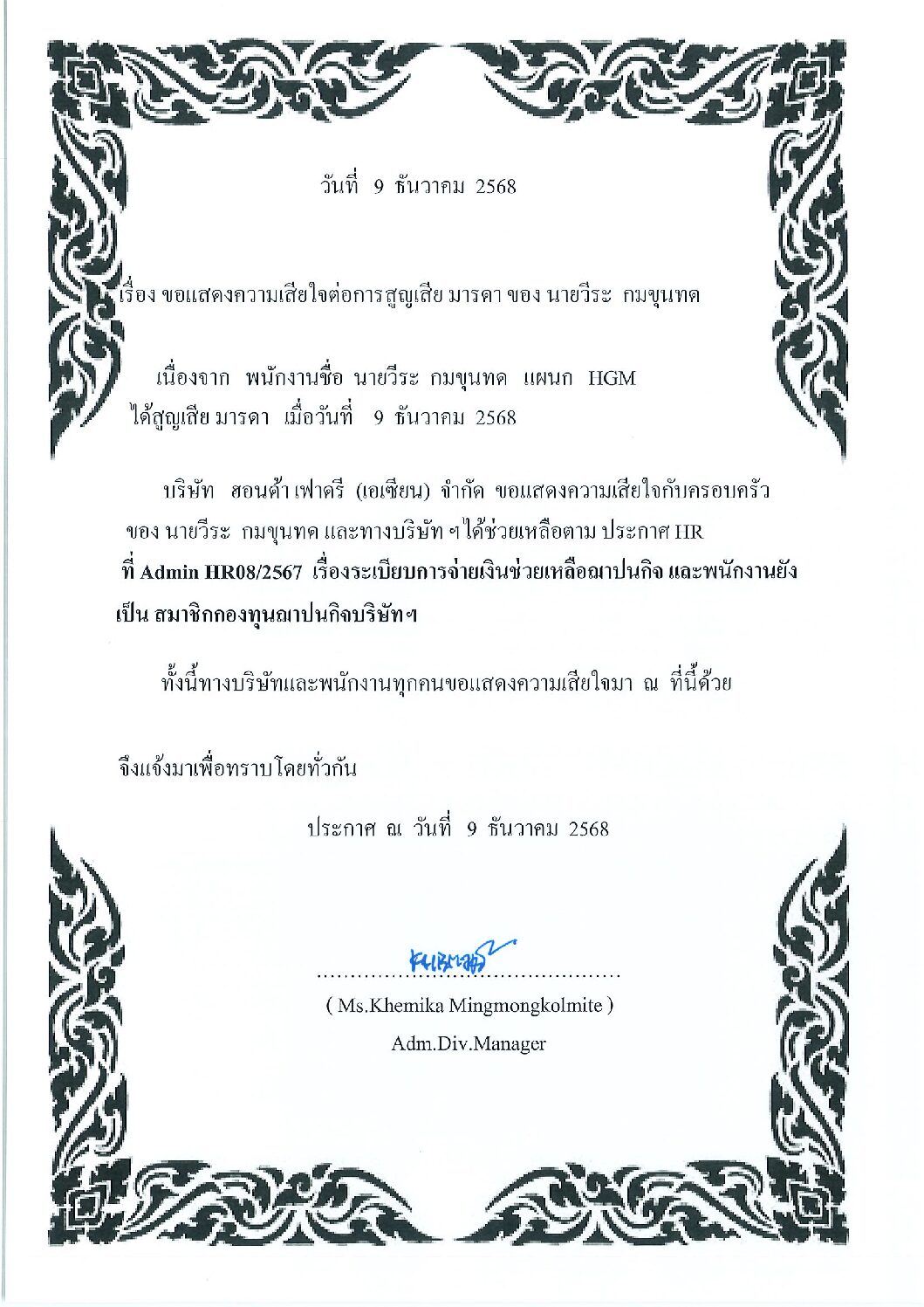 ธ.ค.92025HGMข่าวสารและกิจกรรม (News) Categories: HGM, ข่าวสารและกิจกรรม (News)By Phonprapa09/12/2025 Author: Phonprapa Post navigationPreviousPrevious post:เรื่อง หยุดปฏิบัติงาน ได้รับค่าจ้าง ร้อยละ 75NextNext post:2025.12.09 แต่งตั้งเป็นเจ้าหน้าที่ความปลอดภัยในการทำงานระดับหัวหน้างานRelated posts2026.04.03 ประชาสัมพันธ์กิจกรรมรับบริจาคโลหิต14/03/2026ประชาสัมพันธ์ประชาสัมพันธ์บริการให้คำปรึกษาสุขภาพทั่วไป06/03/2026Event Safety Committee Mar’2603/03/2026แจ้งเปลี่ยนแปลงห้องเบิกจ่ายอุปกรณ์ป้องกันอันตรายส่วนบุคคล (PPE) และ วันเบิก-จ่าย03/03/2026จดหมายข่าวด้านความปลอดภัยอาชีวอนามัย และสิ่งแวดล้อม ประจำเดือนมีนาคม 256903/03/2026ประชาสัมพันธ์ การใช้เหยี่ยวไล่นกภายในโรงงาน03/03/2026ขอแสดงความเสียใจต่อการสูญเสียมารดา นายเปี่ยมศักดิ์ นาคบุญเลิศ03/03/2026Open Canteen 09.02.202608/02/2026