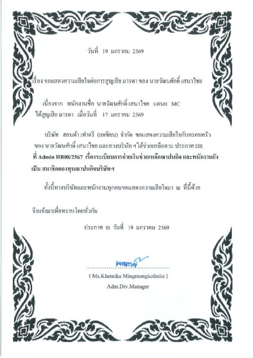 ม.ค.202026Uncategorized Category: UncategorizedBy Phonprapa20/01/2026 Author: Phonprapa Post navigationPreviousPrevious post:ประกาศเพิ่มวันหยุด ประจำปี 2569NextNext post:เรื่อง หยุดปฏิบัติงาน ได้รับค่าจ้าง ร้อยละ 75Related postsประสัมพันธ์กำหนดการวันครบรอบก่อตั้งบริษัท09/03/2026Sport day & Party 202512/12/2025ขอแสดงความเสียใจต่อการสูญเสีย บิดา นางสาวศิริพร เอียการนา12/12/2025Calendar 25KI(April 26 – March 27)10/12/2025เรื่อง หยุดปฏิบัติงาน ได้รับค่าจ้าง ร้อยละ 7501/12/2025ประกาศค่าอายุงาน 5,10,15,20 ปี03/11/2025พระพันปีหลวง27/10/2025เชิญชวนพนักงานลงทะเบียนเข้าร่วมกิจกรรม HFA QCC 2026/24KI13/09/2025