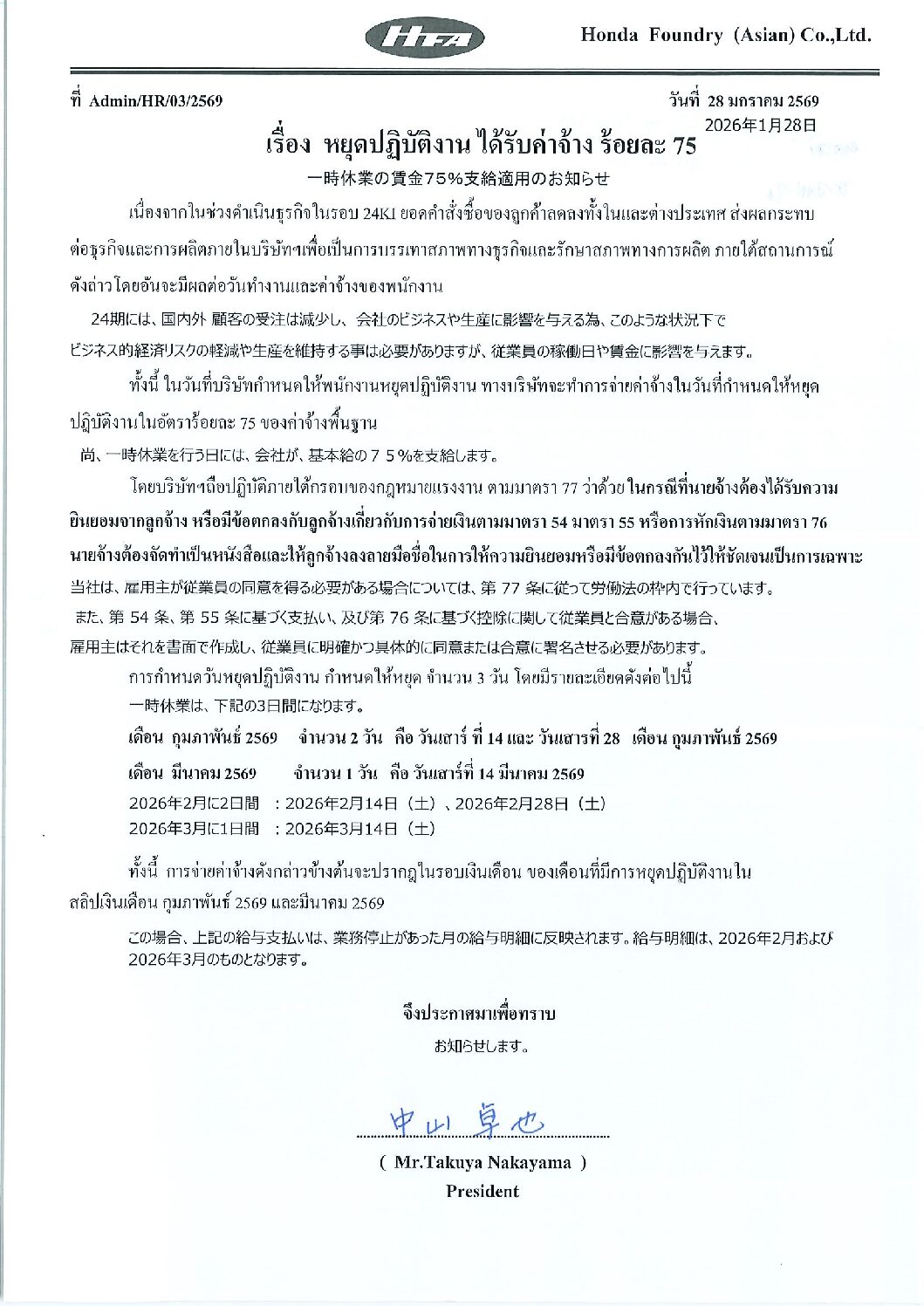 ม.ค.282026HGMกิจกรรมเพื่อสังคม (CSR)เรื่อง หยุดปฏิบัติงาน ได้รับค่าจ้าง ร้อยละ 75 Categories: HGM, กิจกรรมเพื่อสังคม (CSR)By Phonprapa28/01/2026 Author: Phonprapa Post navigationPreviousPrevious post:ขอแสดงความเสียใจต่อการสูญเสียมารดา นายวัฒนศักดิ์ เสนาไชยNextNext post:ประชาสัมพันธ์ การ Support อาหารกลางวันRelated postsประชาสัมพันธ์ การใช้เหยี่ยวไล่นกภายในโรงงาน03/03/2026ขอแสดงความเสียใจต่อการสูญเสียมารดา นายเปี่ยมศักดิ์ นาคบุญเลิศ03/03/2026Open Canteen 09.02.202608/02/2026ประชาสัมพันธ์ การ Support อาหารกลางวัน04/02/2026ประกาศเพิ่มวันหยุด ประจำปี 256906/01/2026ประชาสัมพันธ์การให้บริการ รพ.มทส.20/12/2025ประชาสัมพันธ์การเปลี่ยนสถานพยาบาลประจำปี 256920/12/2025ขอแสดงความเสียใจต่อการสูญเสีย มารดา นายวีระ กมขุนทด09/12/2025