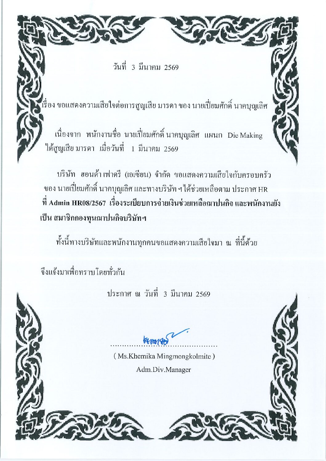 มี.ค.32026HGMข่าวสารและกิจกรรม (News)-นายเปี่ยมศักดิ์-นาคบุญเลิศ-4.pdf Categories: HGM, ข่าวสารและกิจกรรม (News)By Siriwimon03/03/2026 Author: Siriwimon Post navigationPreviousPrevious post:ขอเชิญชวนประกวดออกแบบโลโก้เข็มกลัด Q-Event 25 KiNextNext post:ประชาสัมพันธ์ การใช้เหยี่ยวไล่นกภายในโรงงานRelated posts2026.04.03 ประชาสัมพันธ์กิจกรรมรับบริจาคโลหิต14/03/2026ประชาสัมพันธ์ประชาสัมพันธ์บริการให้คำปรึกษาสุขภาพทั่วไป06/03/2026Event Safety Committee Mar’2603/03/2026แจ้งเปลี่ยนแปลงห้องเบิกจ่ายอุปกรณ์ป้องกันอันตรายส่วนบุคคล (PPE) และ วันเบิก-จ่าย03/03/2026จดหมายข่าวด้านความปลอดภัยอาชีวอนามัย และสิ่งแวดล้อม ประจำเดือนมีนาคม 256903/03/2026ประชาสัมพันธ์ การใช้เหยี่ยวไล่นกภายในโรงงาน03/03/2026Open Canteen 09.02.202608/02/2026ประชาสัมพันธ์ การ Support อาหารกลางวัน04/02/2026